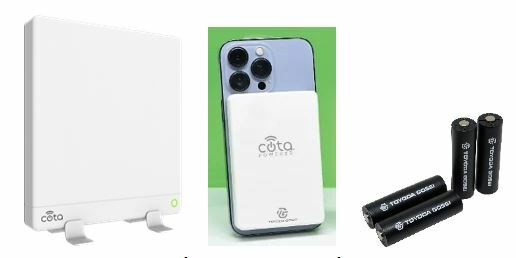 Cota power transmitter (top left), phone charging receiver (center), AA forever battery (Right). Cota power receiver (below).